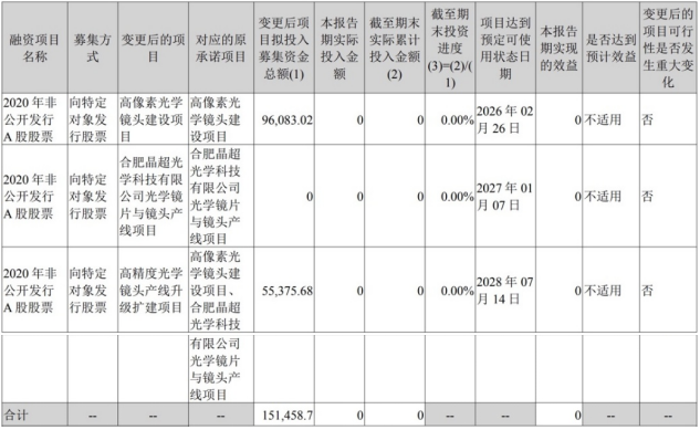 时至2025年上半年,上述拟募投项目及资金投入规划经历了多次调整,项目变更为高像素光学镜头建设项目、合肥晶超光学科技有限公司光学镜片与镜头产线项目,以及高精度光学镜头产线升级扩建项目。