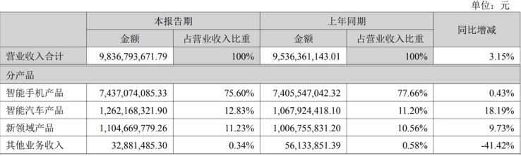 数据显示,2025年上半年,欧菲光的新领域产品板块实现11.05亿元收入,同比有所增加,但在总营收中占比仅11.23%,低于同期智能手机(75.60%)和智能汽车(12.83%)业务板块。智能手机依旧是欧菲光的收入支柱。