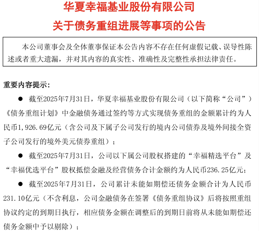 8月16日,华夏幸福发布公告称,截至7月31日,公司《债务重组计划》中金融债务已签约实现债务重组的金额累计约为1926.69亿元;公司以下属公司股权搭建的“幸福精选平台”及“幸福优选平台”股权抵偿金融及经营债务合计金额约为236.25亿元;公司累计未能如期偿还债务金额合计为231.10亿元(不含利息)。