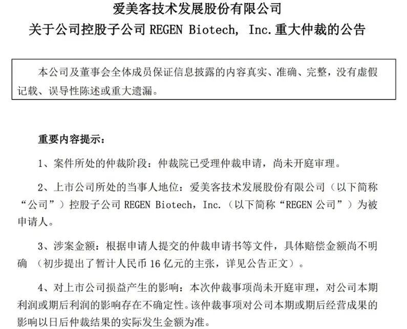 达透医疗进一步提出,若上述仲裁请求未得到仲裁庭支持,则要求裁决REGEN赔偿损失,暂计为16亿元。而达透医疗因本案支出的律师费、保全费等全部法律费用,也要求由REGEN承担。