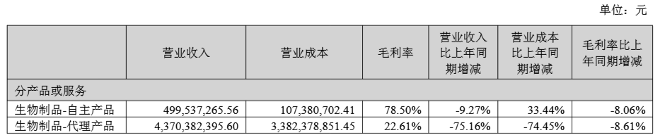 就收入构成来看,智飞生物的收入来源于自主产品和代理产品两部分,其中代理产品是公司的主要收入来源。半年报显示,智飞生物代理产品和自主产品今年上半年分别实现营收43.70亿元和5.00亿元,分别同比减少75.16%和9.27%,毛利率也分别同比减少8.61个和8.06个百分点,这也是该公司上半年收入下降的主要原因。