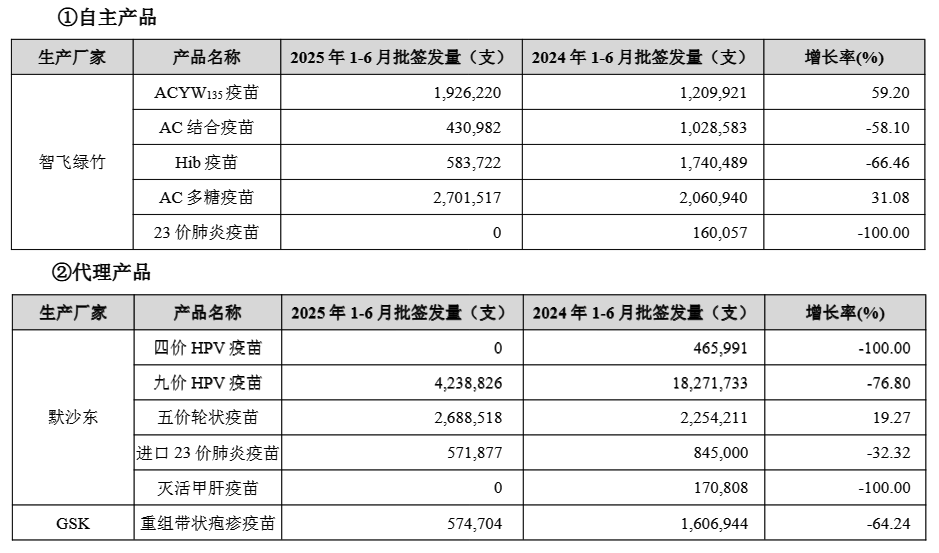 智飞生物自主产品和代理产品今年上半年批签发量情况