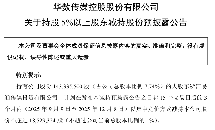 华数传媒(000156.SZ)近日发布公告称,股东浙江易通传媒投资有限公司(以下简称:浙江易通传媒)基于“自身经营需求”,计划在2025年9月9日至12月8日期间,通过集中竞价方式减持不超过1852.93万股(不超过公司总股本的1%)。这也是浙江易通传媒自入股华数传媒以来,首次公布股份减持计划。