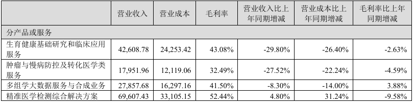 投资时间网、标点财经研究员注意到,华大基因主营业务板块发展已出现一定分化趋势。半年报信息显示,公司主营业务收入主要来源于生育健康基础研究和临床应用服务、肿瘤与慢病防控及转化医学类服务、多组学大数据服务与合成业务、精准医学检测综合解决方案四个方面。