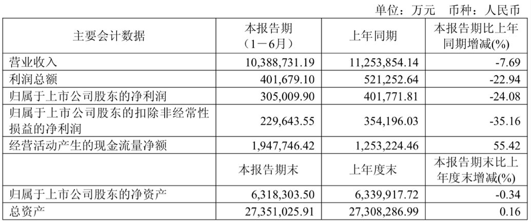 其中第二季度,公司单季度实现营业收入468.98亿元,同比下降13.45%;实现归母净利润9.99亿元,同比下降46.81%;实现扣非净利润10.57亿元,同比下降38.64%。