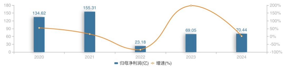 从营收增速来看,恒力石化增长势头逐年趋弱。Wind数据显示,2019年至2024年,公司营收增速分别为67.78%、51.19%、29.94%、12.31%、5.62%、0.65%。利润方面,2019年至2021年,恒力石化连续三年归母净利润超过百亿元,但同比增速持续下滑,分别为202%、34.28%、15.37%。2022年至2024年,公司归母净利润表现波动较大,各年度对应的同比增速分别为-85.07%、197.83%和2.01%。