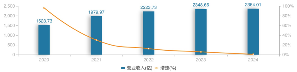 2020年至2024年恒力石化营收、归母净利润同比变化情况(亿元)