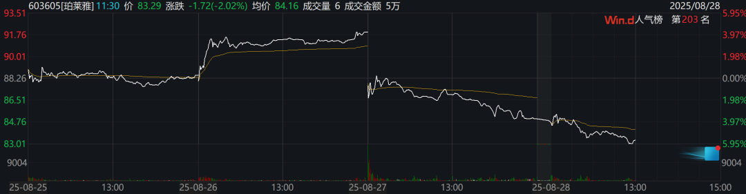 投资时间网、标点财经研究员注意到,虽然珀莱雅于8月26日晚接连发布两份利好公告,但8月27日开盘后,该公司股价仍震荡下跌,当日收于85.01元/股,跌幅7.59%左右。8月28日该股续跌,截至午盘收于83.29元/股,跌幅为2.02%。