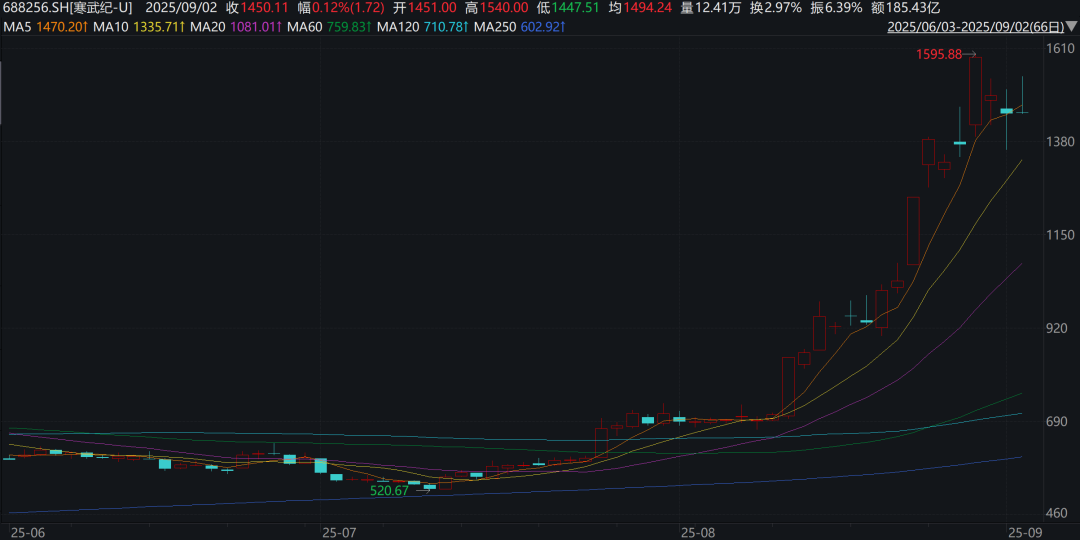但是,9月第一个交易日,寒武纪股价开盘即跳水,早盘一度大跌近9%,最后探底回升,收报1448.39元/股,当日下跌2.95%。这背后发生了什么?