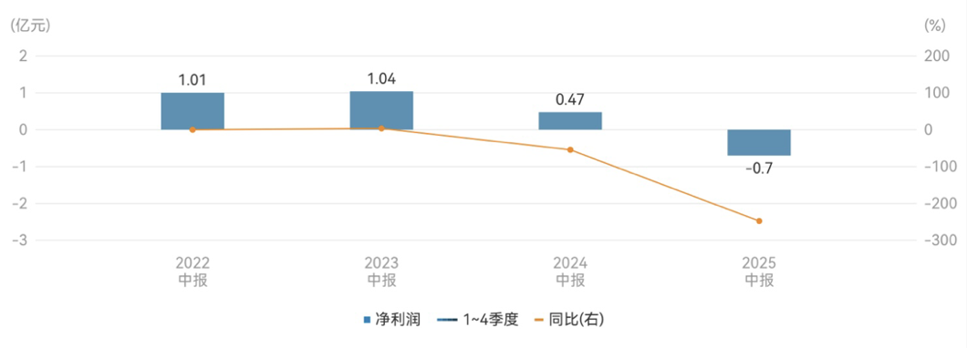 2022年至2025年中报梦金园净利润及同比情况(亿元)