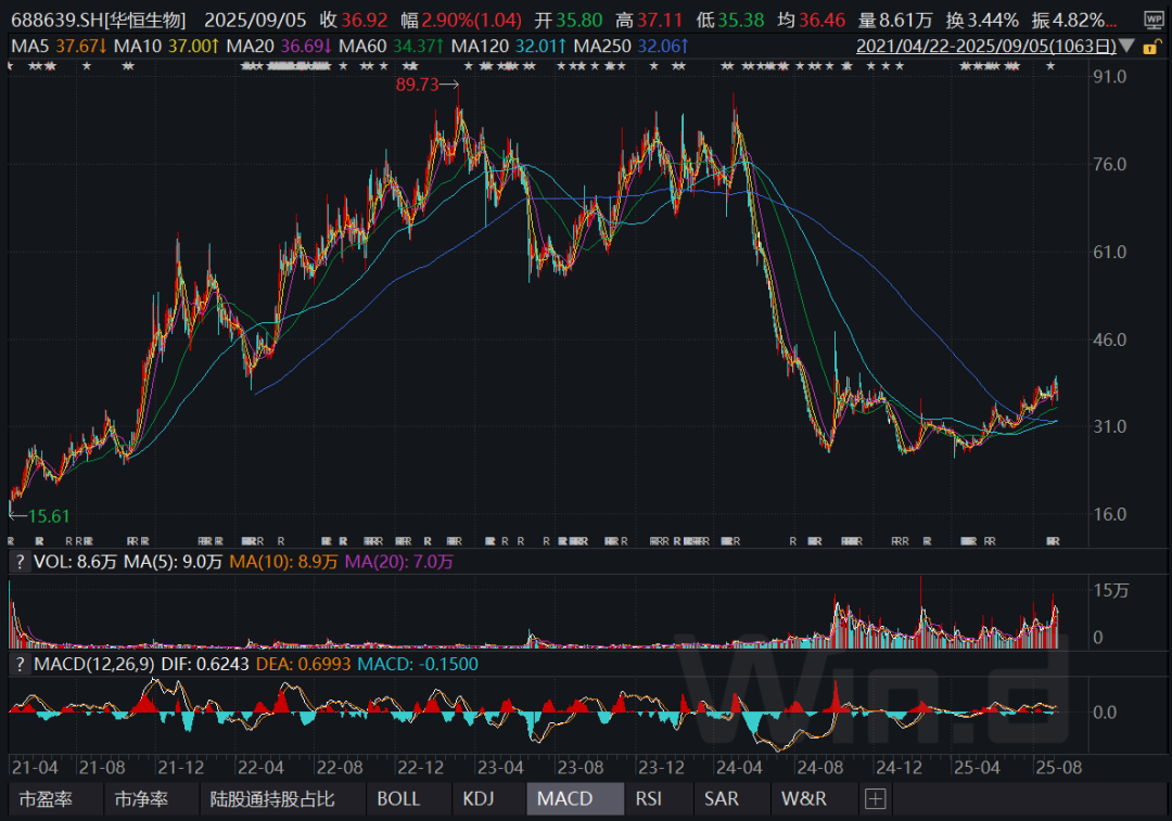 业绩出现波动的同时,公司股价亦走势疲弱。数据显示,华恒生物上市开盘价为35.5元/股,高点时一度突破90元/股。但今年以来,公司股价逐步下探,目前停留在不足40元/股区间。