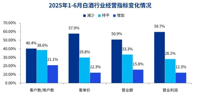 步入2025年,白酒行业形势进一步低迷。《报告》显示,2025年第一季度,我国白酒产量同比减少7.2%,降至103.2万千升。截至2025年上半年,我国酒类生产企业和经销商利润率降低的企业占比近六成,逾五成的企业营业额出现下滑。