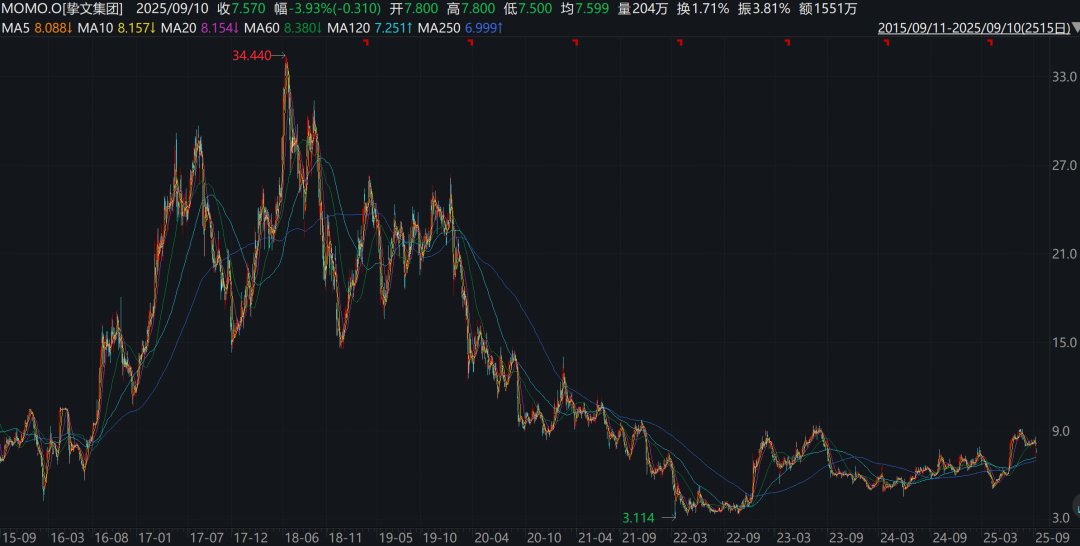 挚文集团的业绩变化对资本市场股价也有所影响。自2018年触及34美元高点后,该股就持续走低,至2022年探底后开始逐步反弹,但最高价也未超过10美元。此后该股波动变化,至2025年4月阶段性探底。随后的4月至7月,挚文集团出现了一波明显的上涨,后又进入下行趋势。披露二季报前后的9月8日至9月10日,挚文集团股价连跌3天,日跌幅分别为4.69%、2.96%、3.93%,截至9月10日收于7.57美元。
