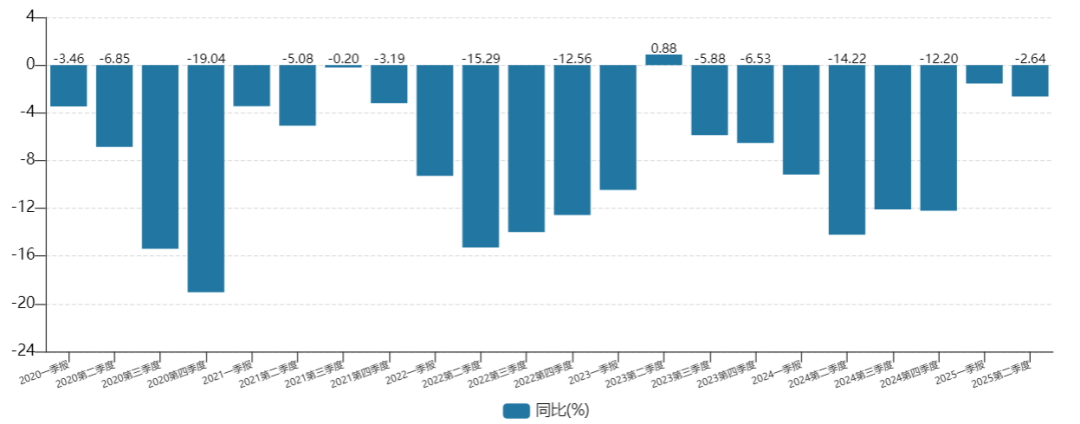 2025年第二季度,该公司实现营收26.2亿元,同比减少2.64%。而从2020年开始,除2023年第二季度外,该公司其他单季营收均处于同比下降的状态。