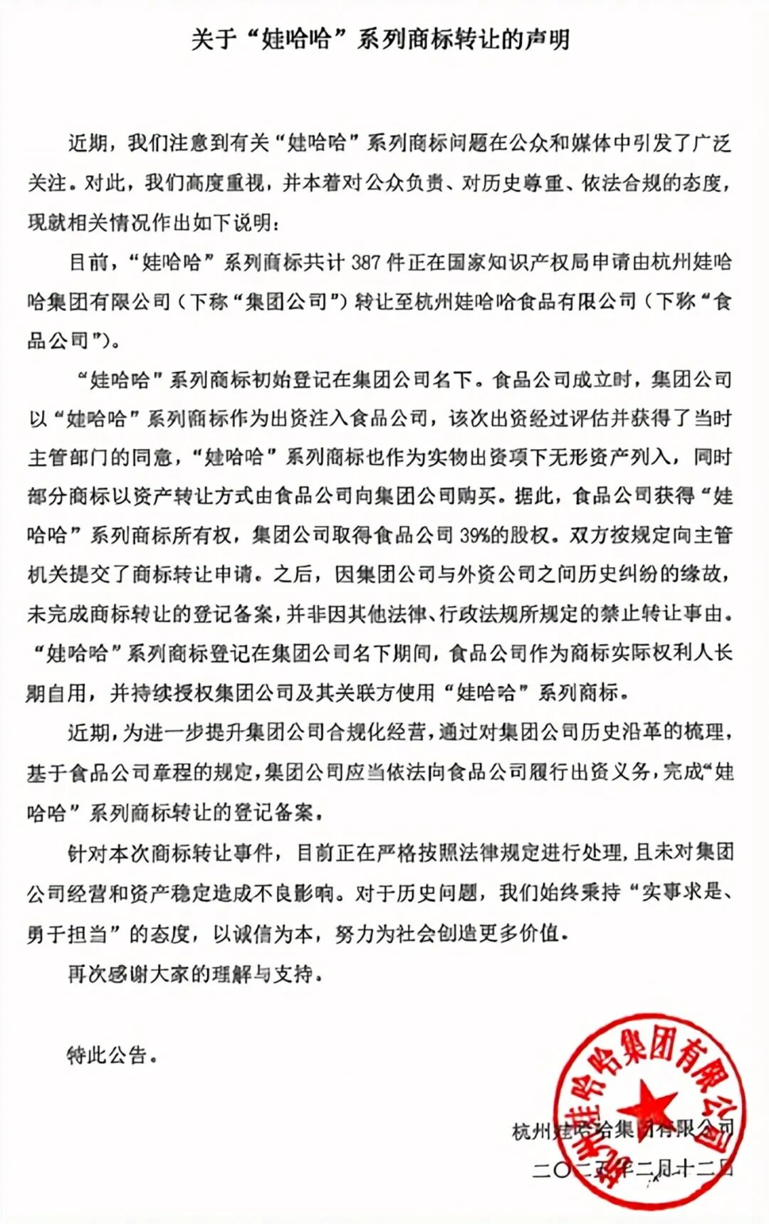 对于这次申请,娃哈哈集团随后发布声明进行了解释。声明称,“娃哈哈”系列商标初始登记在集团公司名下,食品公司成立时,集团公司以“娃哈哈”系列商标作为出资注入食品公司,“娃哈哈”系列商标也作为实物出资项下无形资产列入,同时部分商标以资产转让方式由食品公司向集团公司购买,据此,集团公司取得食品公司39%的股权,但是因集团公司与外资公司之间历史纠纷的缘故,未完成商标转让的登记备案,并非因其他法律、行政法规所规定的禁止转让事由。为进一步提升集团公司合规化经营,通过对集团公司历史沿革的梳理,基于食品公司章程的规定,集团公司应当依法向食品公司履行出资义务,完成“娃哈哈”系列商标转让的登记备案。