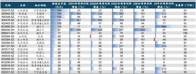 从其统计的人工智能领域基金重仓股中不难看出,多数企业2025年上半年归母净利润均实现高增。其中,细分领域为光模块的新易盛(300502.SZ)、中际旭创(300308.SZ)增速达356%、69%;细分领域为服务器&交换机的胜宏科技、沪电股份(002463.SZ)增速则为367%、48%;AI芯片领域的澜起科技(688008.SH)增速达95%;机器人领域的三花智控(002050.SZ)、蓝思科技(300433.SZ)也均在30%以上。