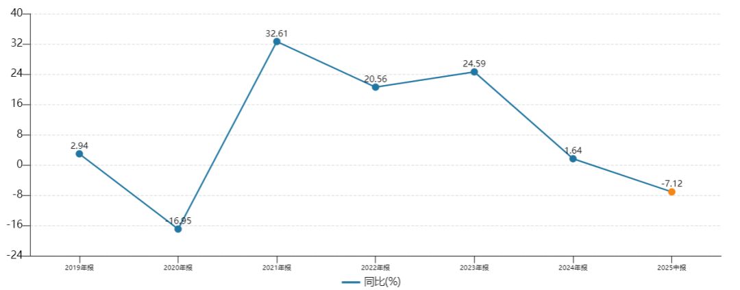 昊海生科2019年至2024年各年度及2025年上半年营收同比增速(%)