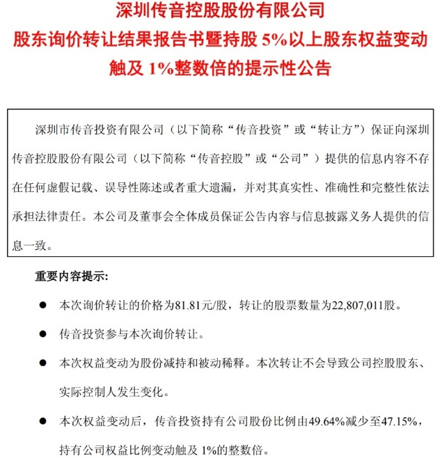 深圳传音控股股份有限公司(下称传音控股,688036.SH)控股股东传音投资的询价转让事项近日落定,其以81.81元/股价格转让了2280.70万股股份,套现金额约为18.66亿元。经被动稀释及本次转让后,传音投资对传音控股的持股比例将从49.64%减少至47.15%,权益比例变动超过1%。