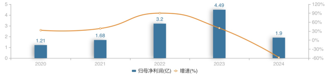 2020年至2024年华恒生物归母净利润及同比增速情况(亿元、%)