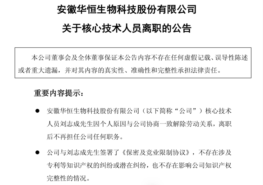 对于二人的离职,华恒生物在公告中均表示,不会对公司的核心竞争力与持续经营能力带来实质性影响。目前,公司研发团队结构完整,后备人员充足,现有核心技术人员及研发团队能够支持公司未来核心技术及创新产品的持续研发工作。