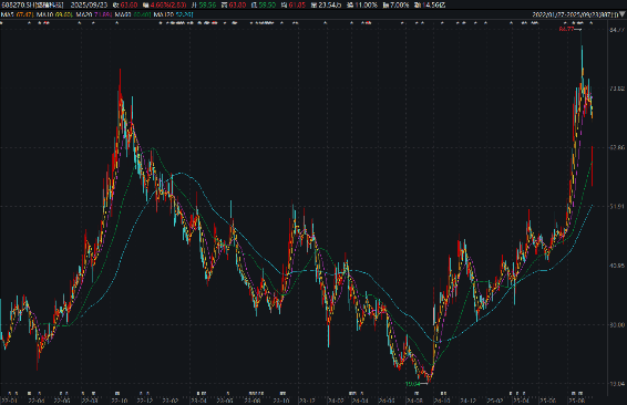 二级市场上,臻镭科技股价从2024年9月下旬开始震荡上行至今,并于今年8月29日盘中触达84.77元/股历史最高点,此后该公司股价开始调整下行。