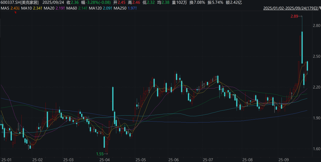 二级市场方面,美克家居近几个交易日股价波动较大。9月17日、18日,该公司连获两个涨停,但9月19日盘中触及跌停。9月22日该股收跌8.64%,9月23日盘中再度涨停。9月24日公司股价继续下跌,截至当日午盘,美克家居报2.36元/股(不复权),跌3.28%,总市值约为34亿元。