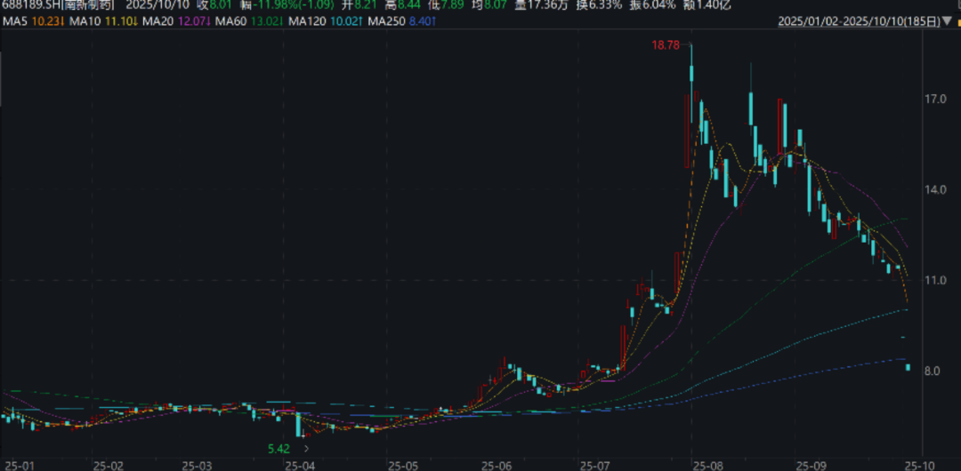 国庆中秋双节假期后A股首个交易日10月9日,市场迎来开门红行情,其中上证指数站上3900点,创下10年新高。不过,湖南南新制药股份有限公司(下称南新制药,688189.SH)却在当日开盘即跌停,报收9.10元/股,下跌19.96%。10月10日,该股续跌,截至午盘跌幅达13.08%。为何会出现这样的情况?