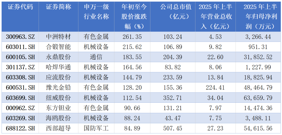 2025年以来中洲特材股价涨幅最高,达261.35%,紧随其后的是合锻智能,涨幅为215.62%