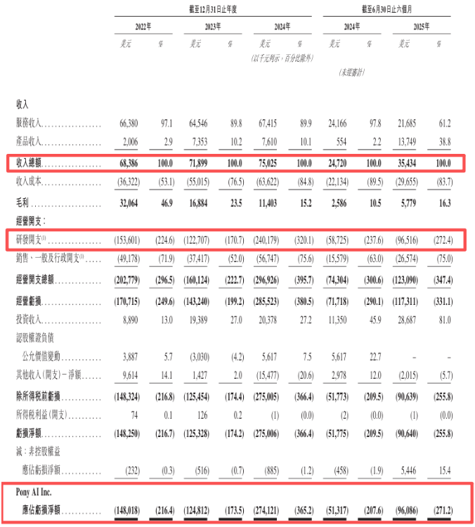 投资时间网、标点财经研究员注意到,规模瓶颈也成为制约小马智行高毛利业务发展的关键因素,导致其收入贡献难以提升,进而对公司整体毛利率形成持续压力。从财务数据来看,公司毛利率自2022年的46.9%逐年下滑至2023年的23.5%和2024年的15.2%,尽管2025年上半年小幅回升至16.3%,但仍处于较低水平。
