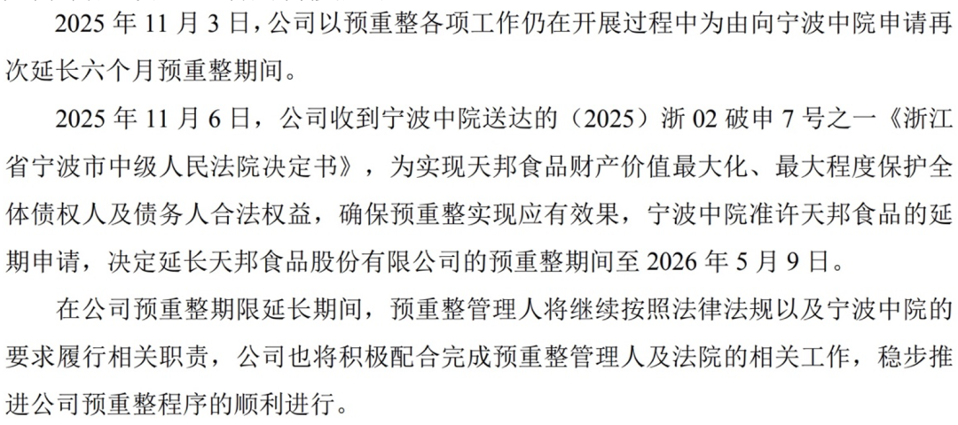 2024年8月,宁波中院决定对天邦食品进行预重整,期间为六个月,并指定北京大成律师事务所、浙江和义观达律师事务所、北京大成(宁波)律师事务所联合担任公司预重整管理人。2025年2月8日,宁波中院准许天邦食品的延期申请,决定延长公司预重整期间至同年5月9日;同年5月8日,宁波中院再度准许了公司的延期申请,延长至同年11月9日。此次已是第三次延期,重整前景充满变数。
