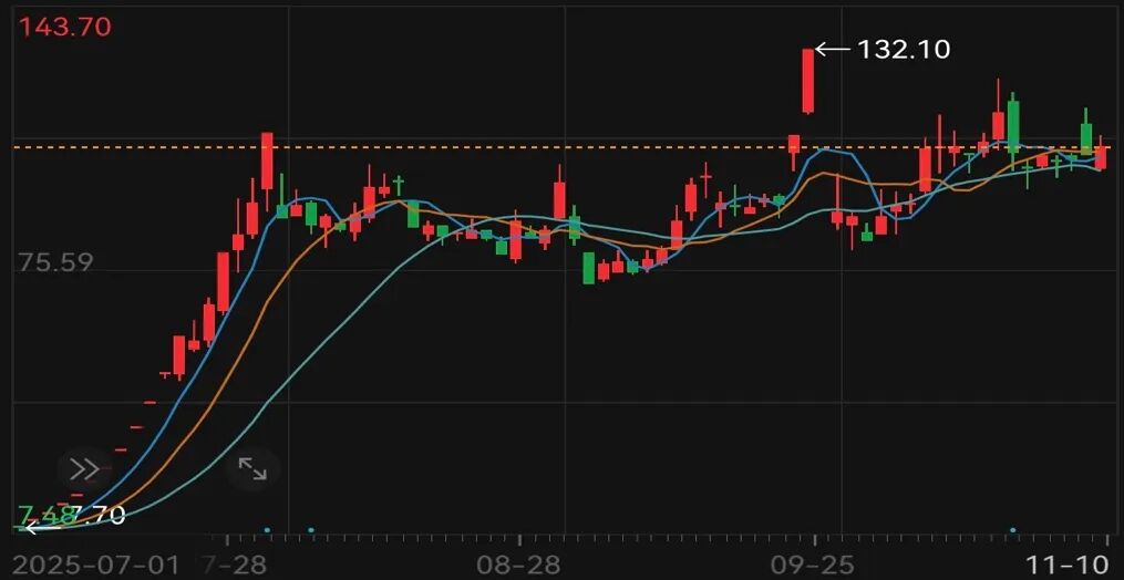 投资时间网、标点财经研究员注意到,自收购事项发布以来,上纬新材股价持续异常波动。2025年7月9日至同年11月6日(约四个月),该公司股价累计上涨1229.95%,短期涨幅显著高于科创综指、科创50及同行业等相关指数涨幅,期间9次触及股票交易异常波动、7次触及严重异常波动情形,公司已累计发布18次异常波动、严重异常波动、交易风险提示公告;7月25日以来上海证券交易所7次公告称已对公司股票进行重点监控。截至2025年11月7日收盘,上纬新材股价涨至104.62元/股(按前复权计算,下同),相较于同年6月30日7.78元/股的收盘价,涨幅高达1244.73%。