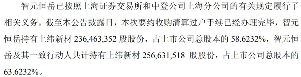 上纬新材公告称,截至11月6日公告披露日,此次要约收购清算过户手续已经办理完毕,智元恒岳持有上纬新材2.36亿股股份,占该公司总股本的58.6232%,智元恒岳及其一致行动人共计持有上纬新材2.57亿股股份,占公司总股本的63.6232%。本次交易完成后,上纬新材的控股股东由SWANCOR萨摩亚变更为智元恒岳,实际控制人为邓泰华。