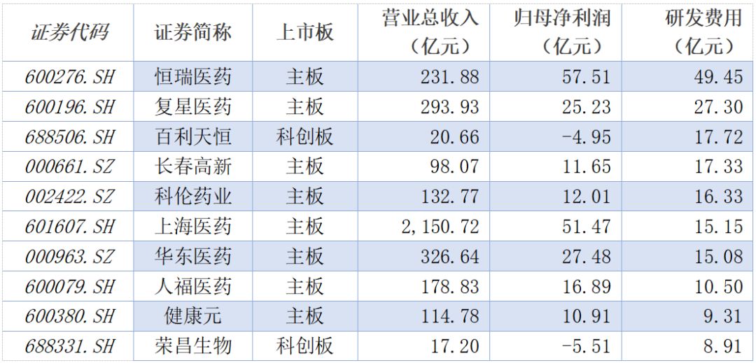 对于创新药企业来说,研发投入是决定公司未来走向及市场地位的核心因素。今年前三季度,A股创新药企业整体保持了高强度研发投入,恒瑞医药、复星医药、百利天恒(688506.SH)、长春高新(000661.SZ)、科伦药业(002422.SZ)、上海医药(601607.SH)、华东医药(000963.SZ)、人福医药(600079.SH)研发费用均超过10亿元,其中恒瑞医药研发费用最高,达到49.45亿元。若考虑健康元(600380.SH)、荣昌生物(688331.SH)9.3亿元及8.9亿元的研发费用在内,综合来看,研发投入排名前十的公司研发费用平均值较末十位高出超18亿元。