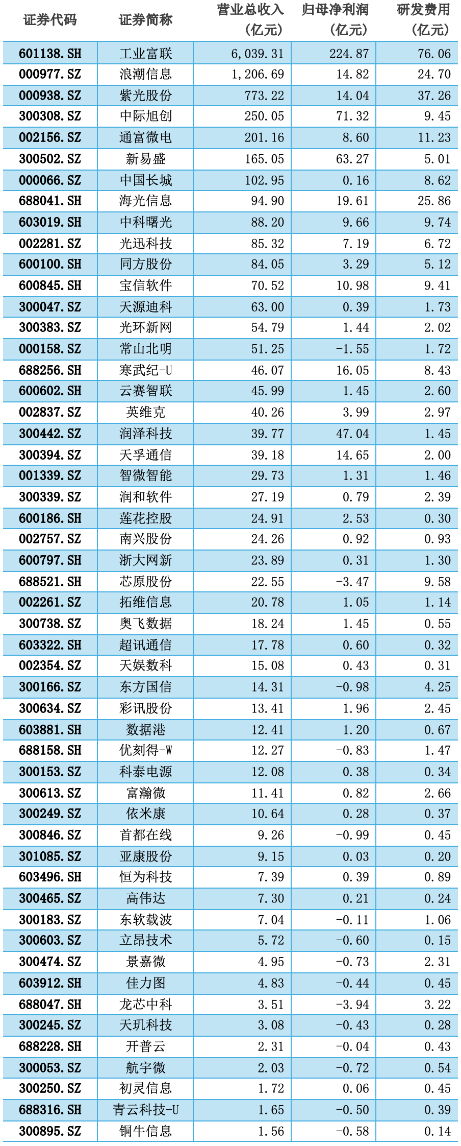 当然,AI行业也相当“烧钱”,52家上市公司中前三季度研发费用均值达到5亿元以上,其中5家公司研发费用在10亿元以上,分别为工业富联(601138.SH,76.06亿元)、紫光股份(000938.SZ,37.26亿元)、海光信息(688041.SH,25.86亿元)、浪潮信息(000977.SZ,24.70亿元)、通富微电(002156.SZ,11.23亿元)。
