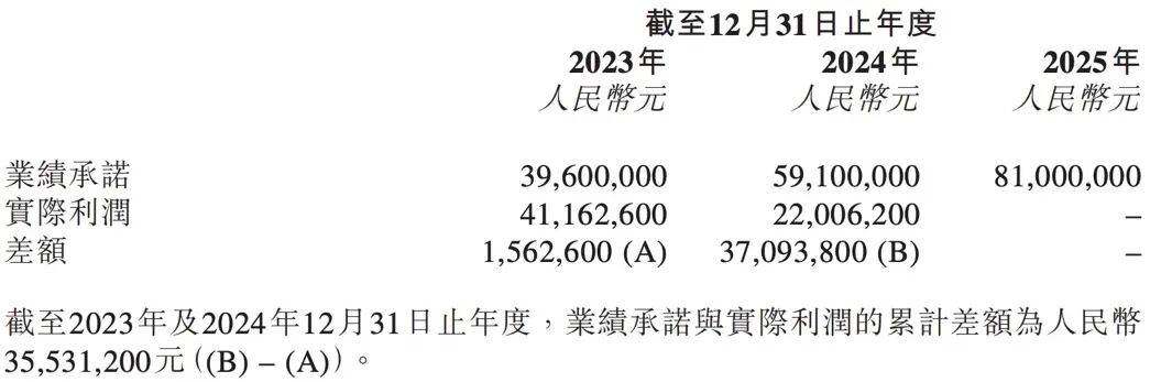 需要注意的是,此前收购曾涉及业绩承诺。彼时,前转让方向受让方承诺,2023年、2024年和2025年三年里,目标公司业务利润分别不低于3960万元、5910万元和8100万元。实际情况是目标公司2023年、2024年实现的利润分别为4116.26万元和2200.62万元,业绩承诺与实际利润的累计差额达到3553.12万元,根据协议,截至2024年12月31日止年度的现金补偿应为2768.15万元。