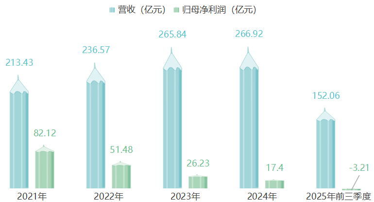 但好景不长,2022年至2024年,公司营收规模虽保持增长,但2024年同比增速已放缓至0.41%;归母净利润更录得“三连降”,同比降幅为37.39%、49.05%和33.64%。2024年,公司实现营收266.92亿元,几乎原地踏步;归母净利润为17.40亿元,是巅峰时的两成多。