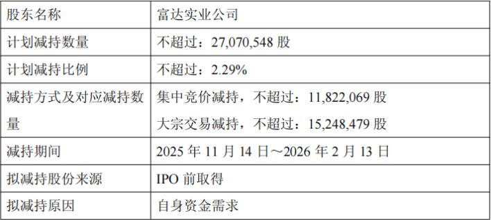 11月10日晚间,合盛硅业(603260.SH)公告称,股东富达实业公司(下称富达实业)因自身资金需求,计划自2025年11月14日至2026年2月13日,通过集中竞价和大宗交易合计减持不超过2707.05万股,约占公司总股本2.29%。