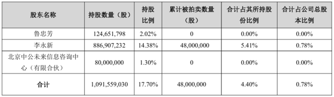 控股股东李永新及其一致行动人鲁忠芳所持股份累计被拍卖情况