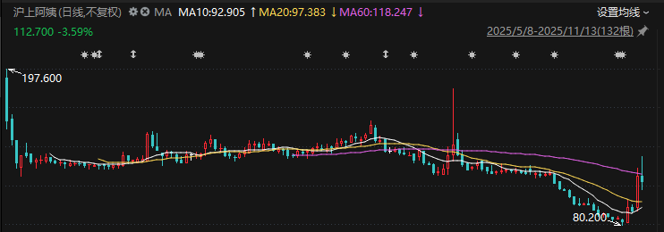 11月12日,沪上阿姨(02589.HK)股价突然飙涨28.96%。13日,该股盘中再涨超12%,最高价达至131.50港元/股(不复权,下同),此后冲高回落,截至当日收盘报112.70港元/股,较前一交易日跌3.59%。14日,沪上阿姨股价走低,盘中跌幅超5%,市值约为114亿港元。