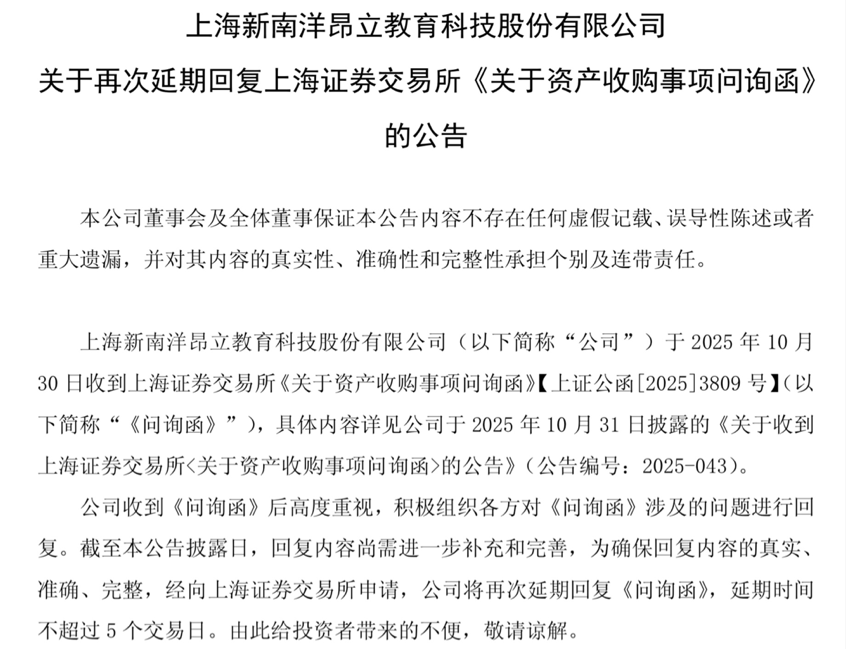 公告发布当晚,昂立教育就收到了上交所下发的问询函。不过,公司并未在要求时间内提交回复。此后,昂立教育再发公告称,将再次延期回复上交所就其拟溢价收购亏损公司事项下发的问询函,延期时间不超过5个交易日。截至11月17日,昂立教育尚未发布回复公告。