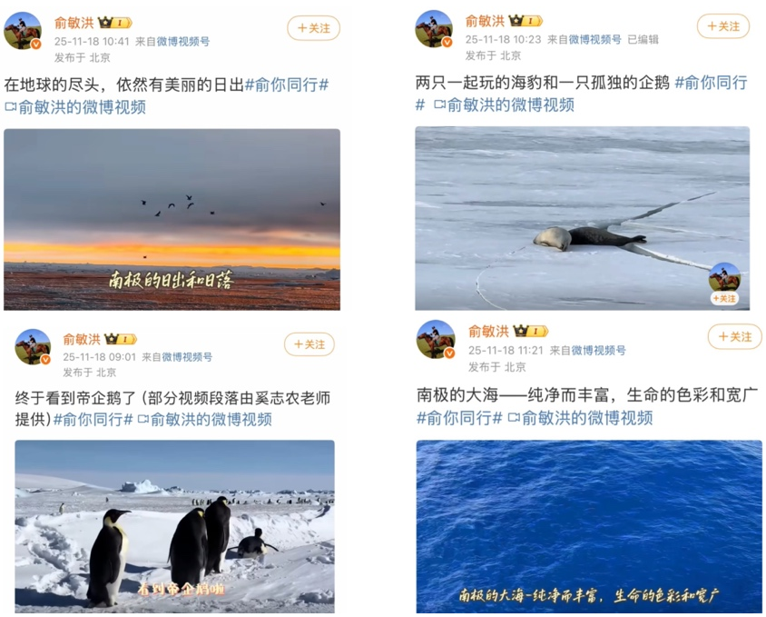 俞敏洪个人微博接连更新多条南极视频(截取部分)