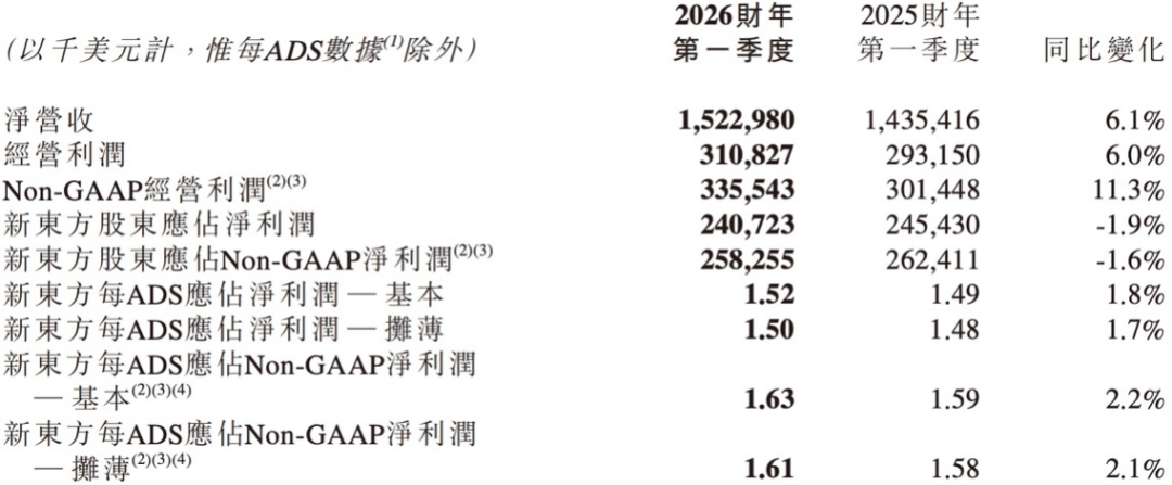 2026财年第一季度,新东方财务指标承压,营收及利润同比增速大幅回落