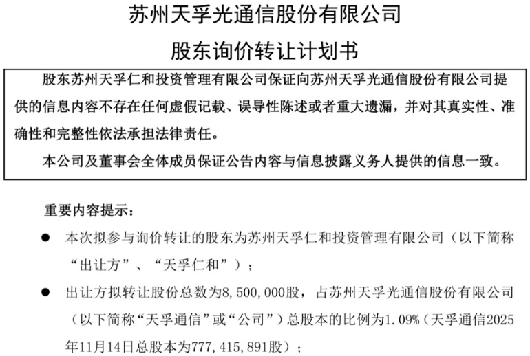 《股东询价转让计划书》显示,天孚通信控股股东苏州天孚仁和投资管理有限公司(下称天孚仁和)拟询价转让850万股,占天孚通信总股本的比例为1.09%,转让原因为自身资金需求。