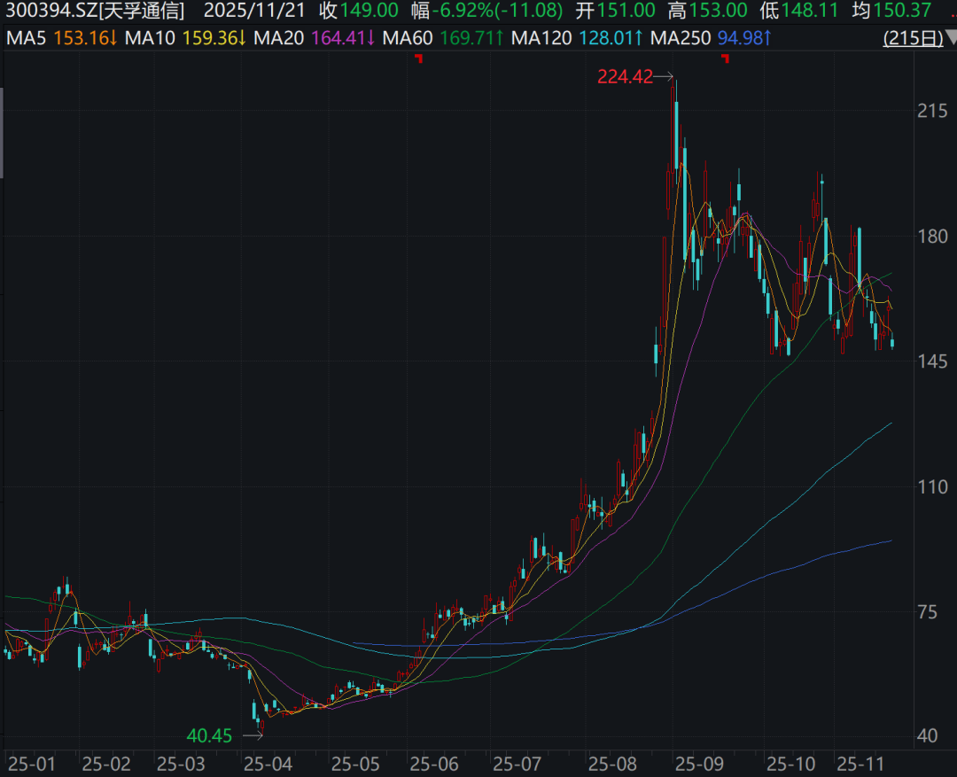 随后,天孚通信股价开始下滑,并在10月中一度低至146.20元/股,在一个月左右下跌超过3成。截至11月21日10时40分,该股报149.02元/股,总市值约为1158亿元。
