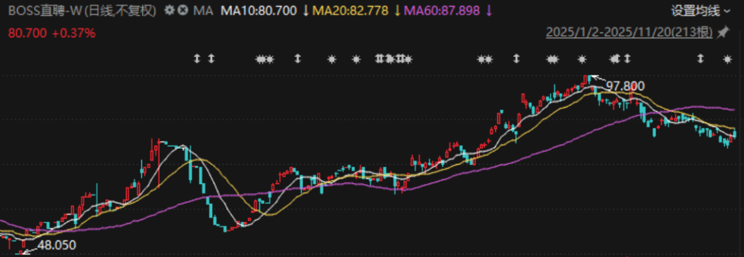 对于今年第四季度的业绩情况,BOSS直聘预计,总收入介于20.5亿元至20.7亿元之间,同比增幅为12.4%至13.5%。对此市场反应较为平淡,11月19日、20日,BOSS直聘港股股价微涨,11月20日报收于80.7港元/股(不复权,下同)。