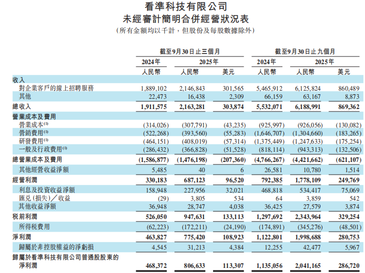 BOSS直聘2025年第三季度和前三季度业绩情况