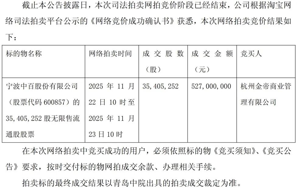 根据裁定,除西藏泽添所持的宁波中百3540.53万股无限售流通股股票外,登记所有人竺仁宝所持公司的1888.40万股无限售流通股股票也在拍卖之列,这部分股票同样由杭州金帝商业管理有限公司竞得。据悉,竺仁宝原本为宁波中百持股5%以上股东,所拍卖的股票为其所持公司的全部股份,已于2025年11月初完成过户登记手续,竺仁宝不再持有公司股份。