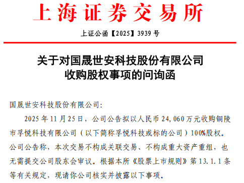 对于此次收购,交易所火速下发问询函,从交易公允性、交易对手方、交易后续安排、内幕交易四方面展开问询,并要求国晟科技在5个交易日内作出说明。