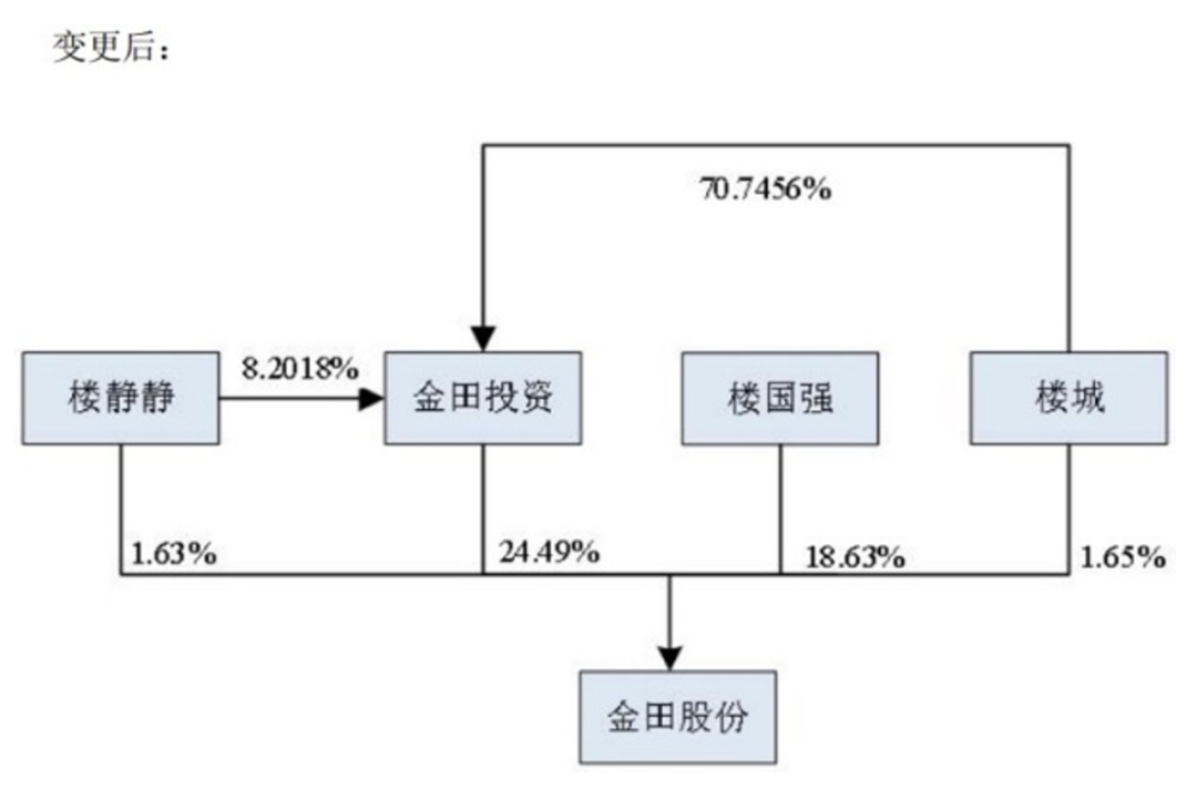 权益变动完成后,陆小咪、楼国强不再持有金田投资股权,楼城、楼静静分别持有金田投资70.7456%、8.2018%股权;公司控股股东仍为金田投资,实际控制人由楼国强、陆小咪、楼城调整为楼国强和楼城。