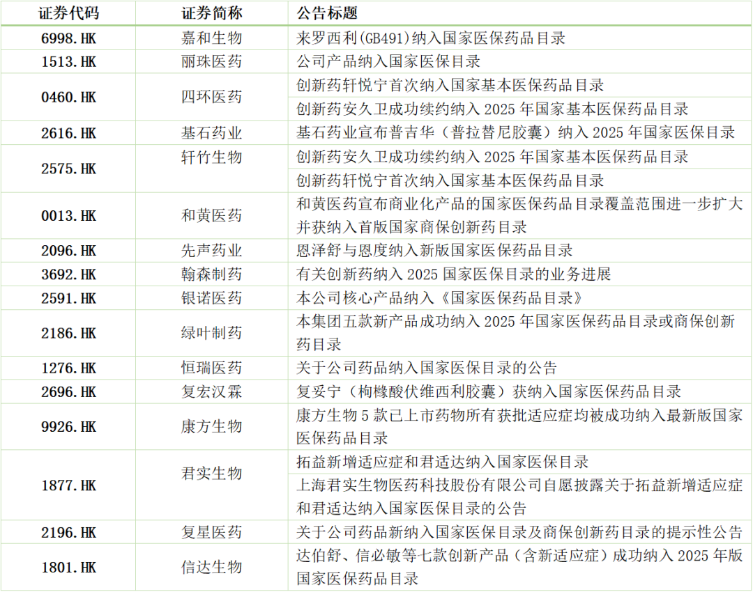据投资时间网、标点财经研究员不完全统计,截至12月9日,A股共有包括恒瑞医药(600276.SH)、复星医药(600196.SH)等在内的36家上市发布公司产品纳入医保目录公告;H股有包括信达生物(1801.HK)、轩竹生物(2575.HK)等16家上市公司发布公司药品纳入医保目录公告(A、H股同时上市公司重复计算)。此外,诸如礼来(LLY.NYSE)、阿斯利康(AZN.LSE/AZN.NYSE)、葛兰素史克(GSK.LSE/GSK.NYSE)等跨国药企亦有产品纳入目录。